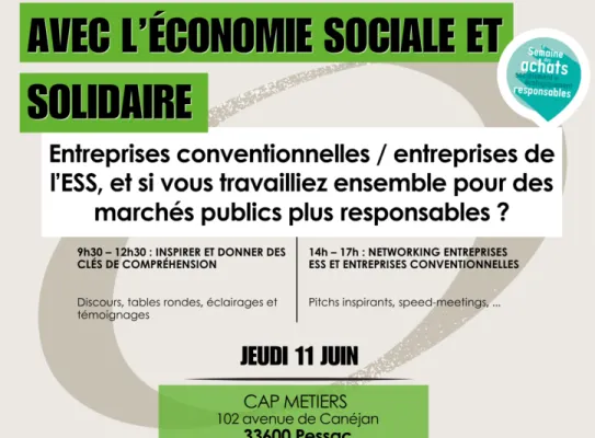 Suite à la réussite de la journée « Développer les achats responsables avec l’ESS » de 2025, le consortium du PRASER (Parcours Régional des Achats Socialement et Écologiquement Responsables), composé de la CRESS Nouvelle-Aquitaine, INAE, 3AR et UNEA, organise deux événements dans le cadre de la Semaine des achats socialement et écologiquement responsables (du 08 au 12 juin).
