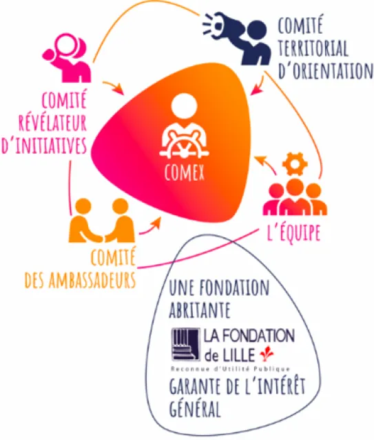 Abritée par la fondation de Lille reconnue d’utilité publique et garante de la bonne utilisation des fonds, la fondation repose sur une gouvernance transparente et collaborative. Le Comex fixe les orientations stratégiques et valide les décisions financières. Le Comité territorial d’orientation analyse les enjeux du territoire et contribue à définir les priorités d’action. Le Comité des Ambassadeurs mobilise les mécènes et développe les ressources. Le Comité révélateur d’initiatives élabore les appels à projets et veille à l’impact des actions soutenues. L’ensemble est animé par une équipe opérationnelle, appuyée par des partenaires et experts du territoire.